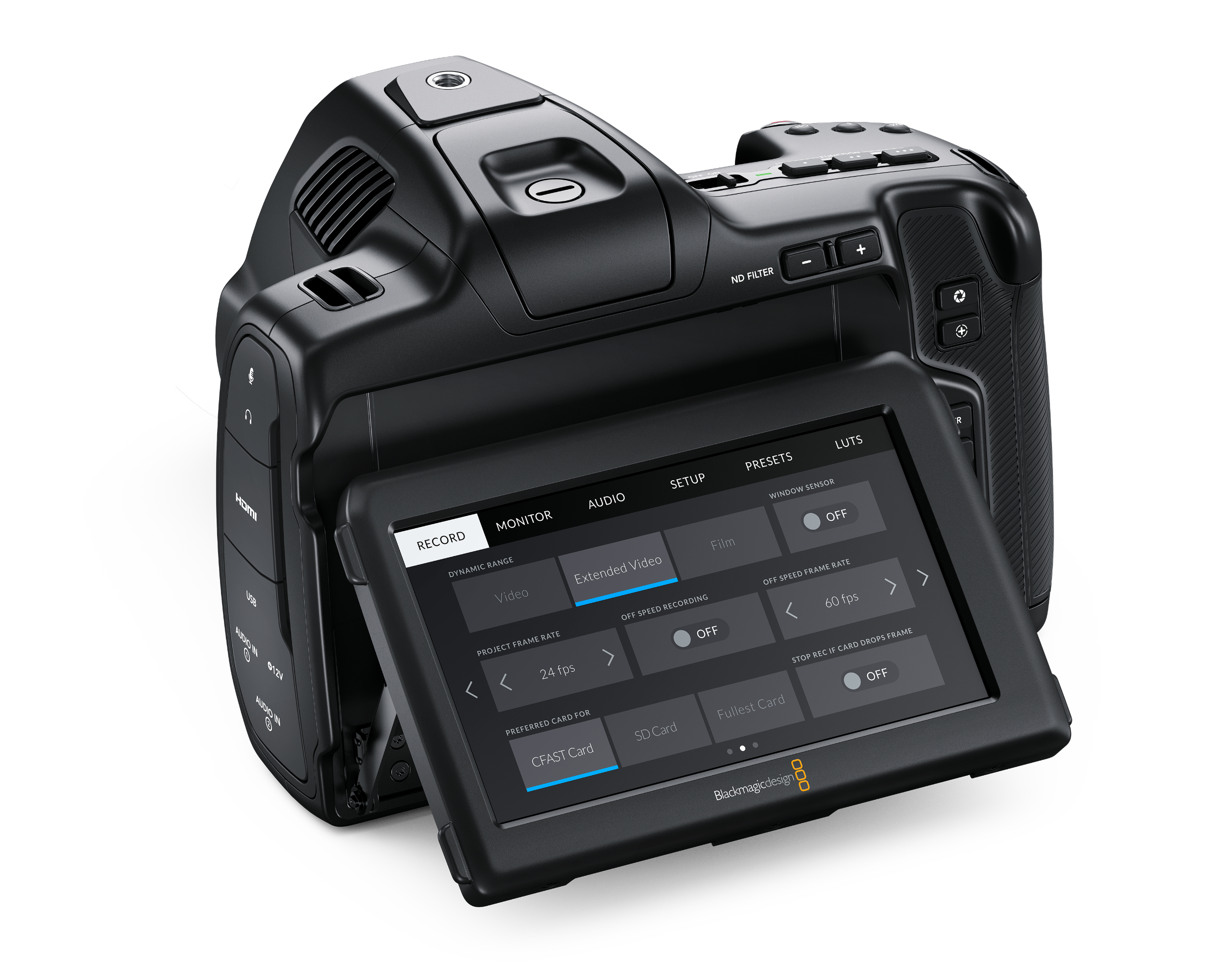 1 x CFast card slot, 1 x SD UHS‑II card slot, 1 x USB-C 3.1 Gen 1 expansion port for external media for Blackmagic RAW and ProRes Recording.