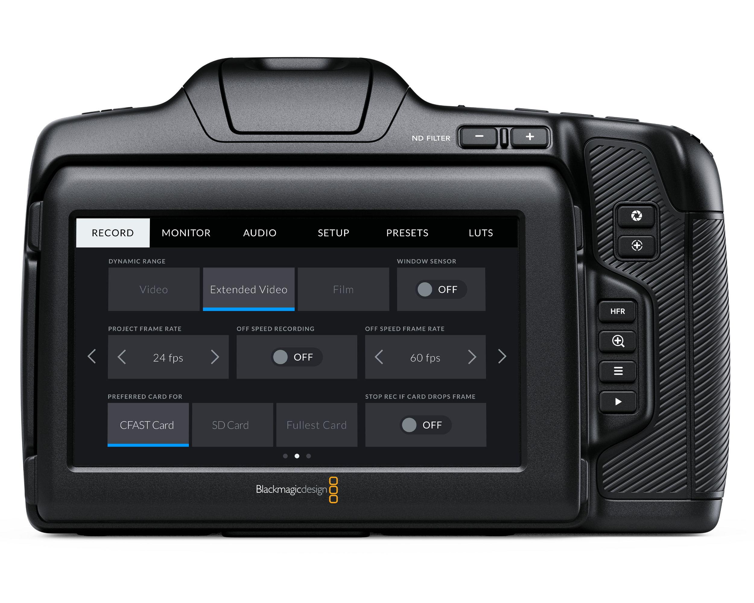 Touchscreen menus on 5 inch screen. 1 x Power Switch,1 x Record Button, 1 x Stills Button, 1 x Scroll Wheelwith push integrated into handgrip, 1 x ISO Button, 1 x White Balance, 1 x Shutter Button, 3 x software configurable Fn buttons, 2 x ND filter button, 1 x Focus Button, 1 x IRIS Button, 1 x High Frame Rate (HFR) Button, 1 x Zoom Button, 1 x Menu Button and 1 x Playback Button.